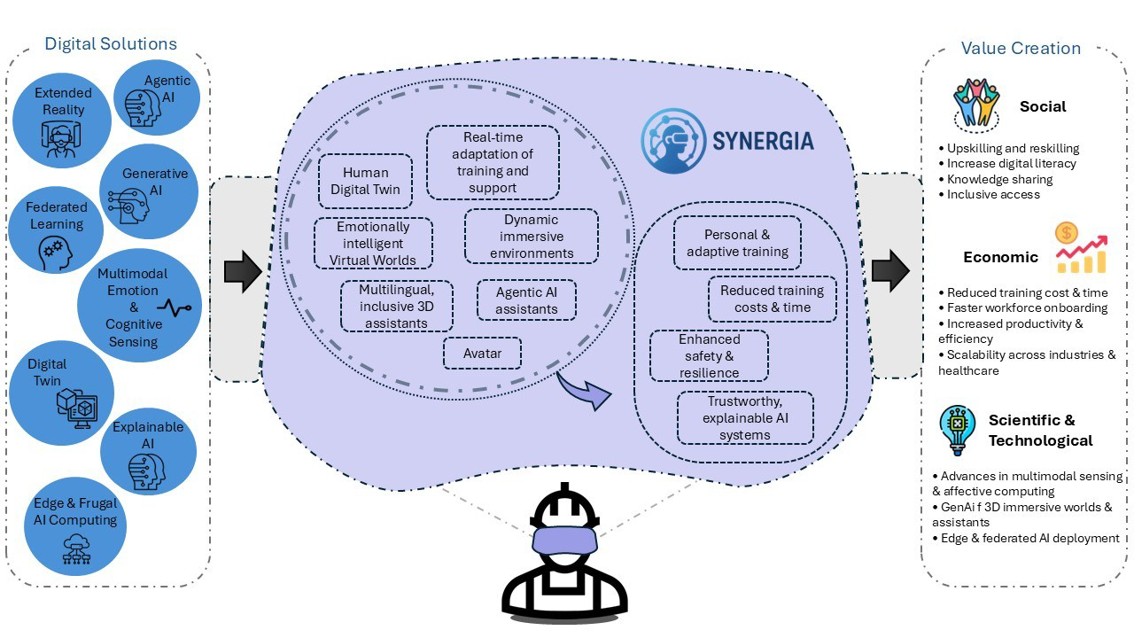 SYNERGIA si propone di affrontare i limiti degli attuali sistemi di formazione e supporto virtuali, che rimangono rigidi, predefiniti e incapaci di rispondere alle esigenze cognitive, emotive e di accessibilità di utenti diversi.